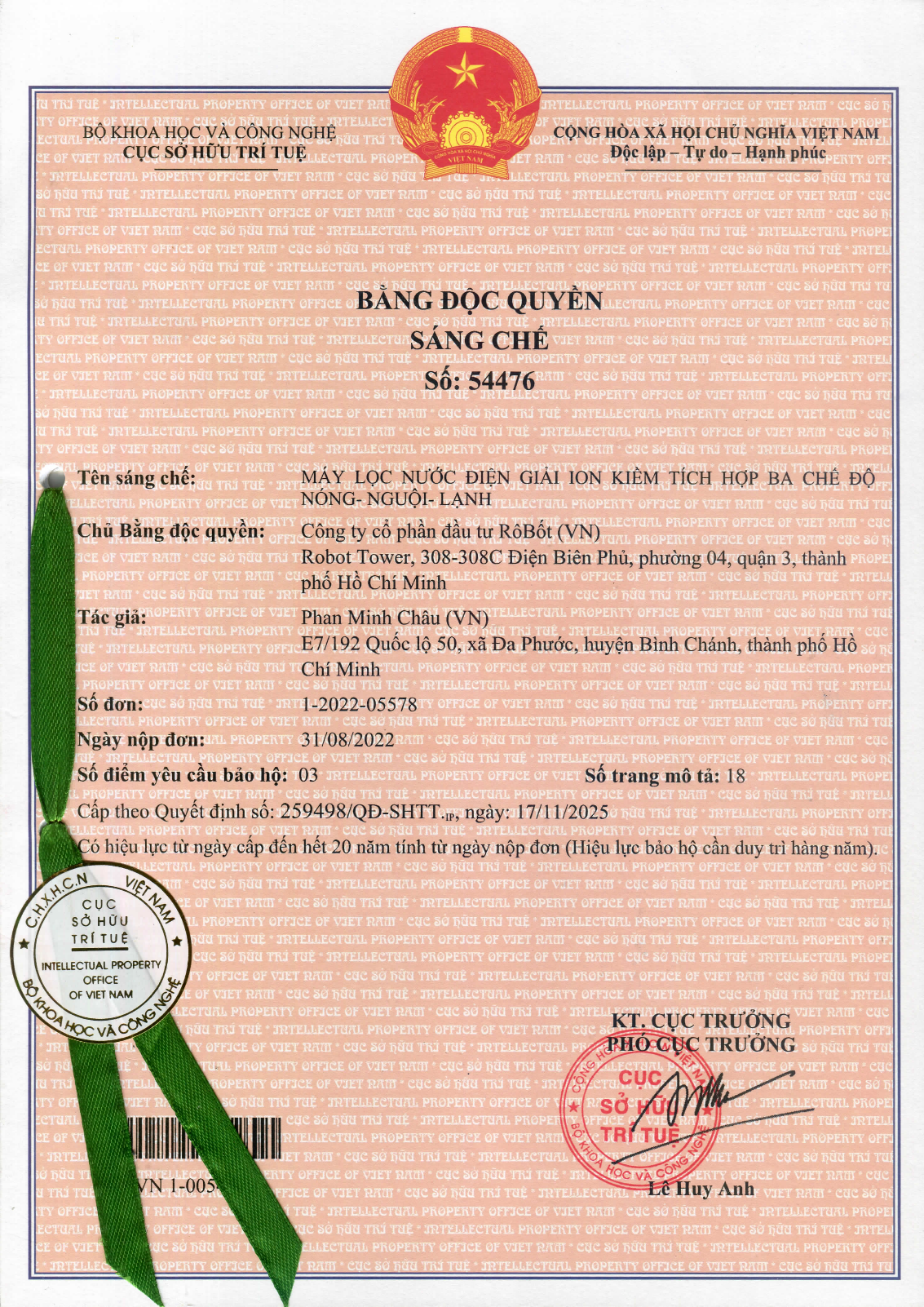 Máy lọc nước điện giải ion kiềm ROBOT tích hợp chế độ Nóng thông minh – Lạnh đã được Cục Sở hữu trí tuệ thuộc Bộ Khoa học và Công nghệ Việt Nam chính thức cấp Bằng độc quyền sáng chế. Đây là cơ quan quản lý nhà nước cao nhất về sở hữu trí tuệ tại Việt Nam, có thẩm quyền thẩm định và bảo hộ các giải pháp kỹ thuật có giá trị khoa học và khả năng ứng dụng thực tiễn.