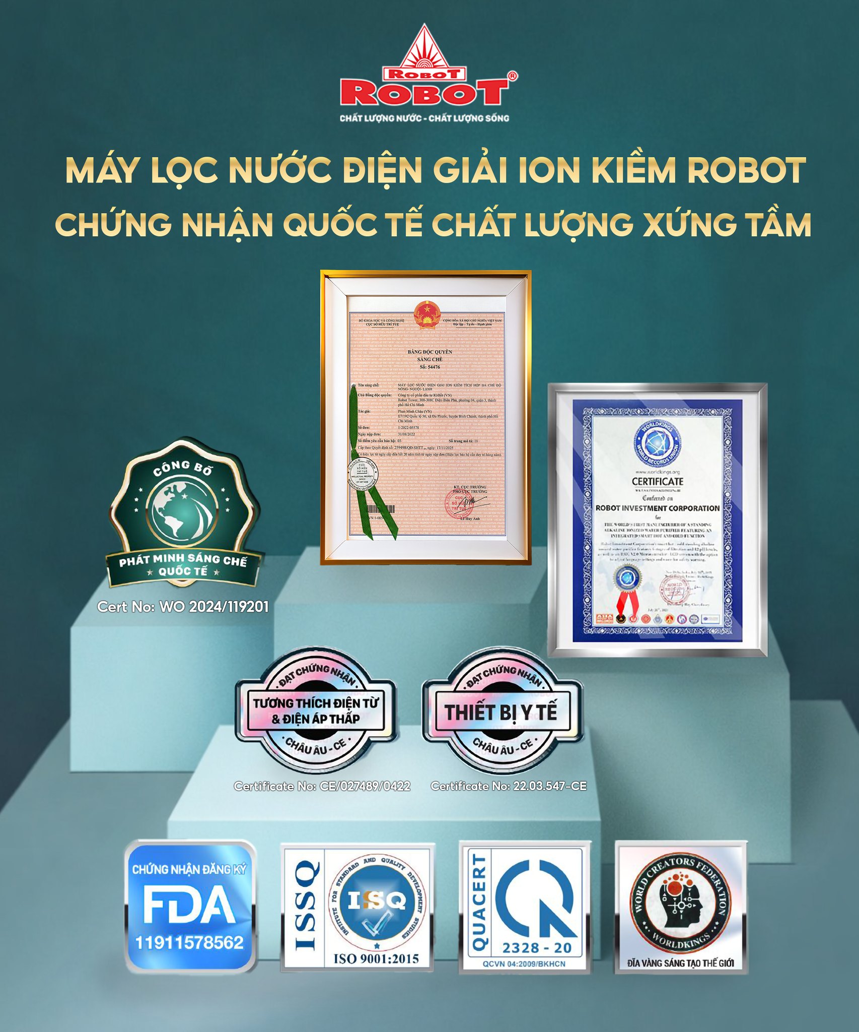 Song song với Bằng độc quyền sáng chế, các dòng Máy lọc nước điện giải ion kiềm ROBOT còn được phát triển và sản xuất theo hệ thống tiêu chuẩn chất lượng quốc tế nghiêm ngặt. Đây là lớp bảo chứng quan trọng, giúp người dùng không chỉ tin vào công nghệ, mà còn an tâm về độ an toàn và tính ổn định trong quá trình sử dụng lâu dài. Các sản phẩm đáp ứng và tuân thủ loạt tiêu chuẩn, chứng nhận trong nước và quốc tế danh giá, tiêu biểu như: