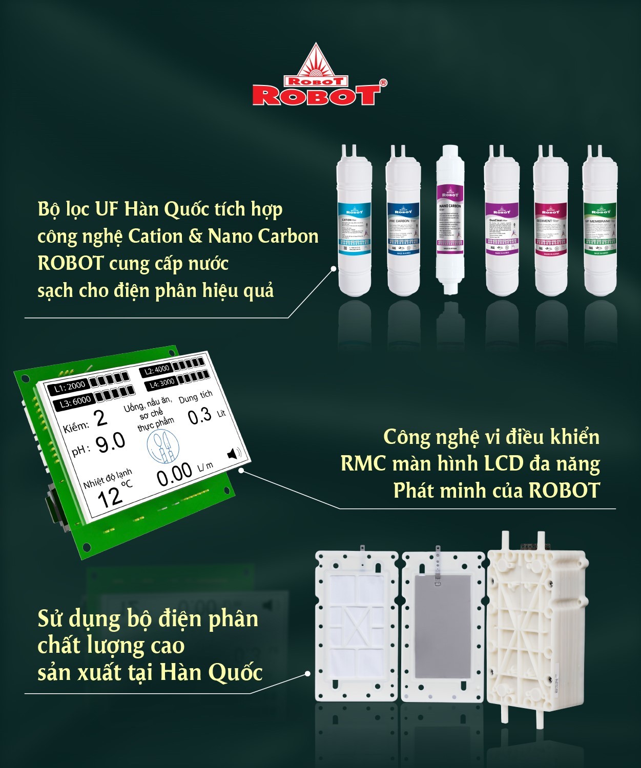 Khác với cách tích hợp rời rạc thường thấy, giải pháp sáng chế của ROBOT được xây dựng theo tư duy đồng bộ ngay từ nền tảng kỹ thuật. Hệ thống đồng bộ 3 công nghệ: bộ lọc, bộ điện phân và bộ vi điều khiển thông minh RMC/LCD.