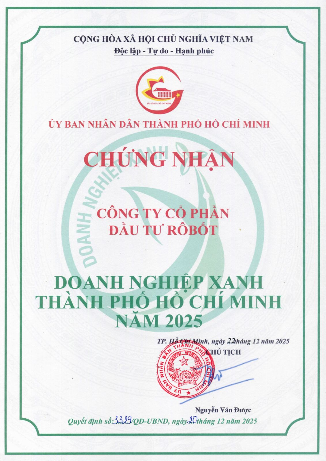 Ủy ban Nhân dân TP.HCM trao Chứng nhận Doanh nghiệp Xanh năm 2025 cho Công ty Cổ phần Đầu tư ROBOT