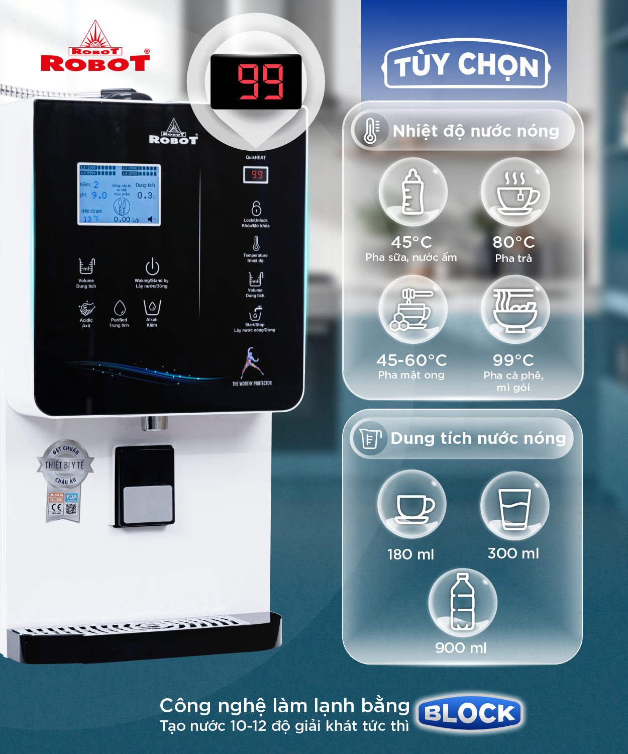 Ngoài tính năng điện giải vượt trội, ROBOT ionQueen còn được tích hợp công nghệ Nóng thông minh cho phép người dùng tùy chọn nhiệt độ nước nóng 45/60/80/99°C và các mức dung tích 180/300/900 ml giúp pha trà – cà phê, pha sữa – mật ong, nấu mì,... tất cả chỉ với một chạm. Đây là tính năng tiện ích hơn hẳn so với các sản phẩm điện giải ion kiềm nhập khẩu vốn chỉ thuần về điện giải.