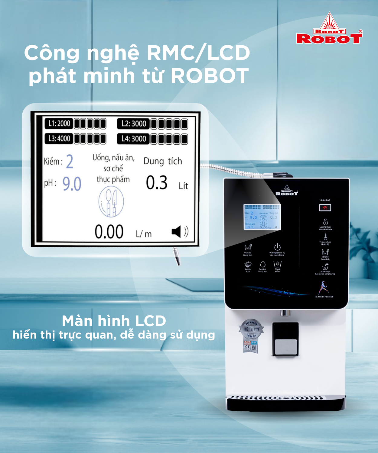 Công nghệ RMC/LCD cho phép quản lý hoạt động máy đồng thời mang đến các chức năng tiện ích, an toàn. Thông tin được hiển thị trực tiếp trên màn hình LCD: từ tuổi thọ lõi lọc, mức pH và công dụng, lưu lượng và nhiệt độ nước kết hợp thông báo bằng giọng nói cho trải nghiệm dùng nước hiện đại và đầy tiện nghi.