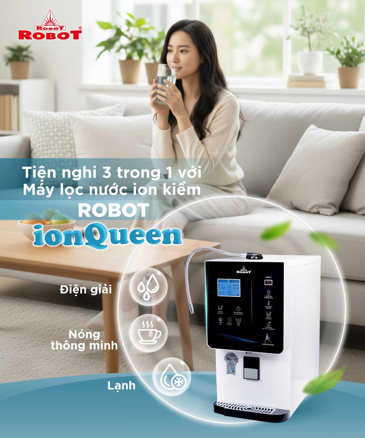 Với tầm nhìn tạo ra giải pháp nước toàn diện cho gia đình hiện đại, ROBOT giới thiệu máy lọc nước điện giải ion kiềm ionQueen, một thiết bị 3 trong 1: điện giải - nóng thông minh – lạnh, định nghĩa chuẩn mực mới về sự tiện nghi.
