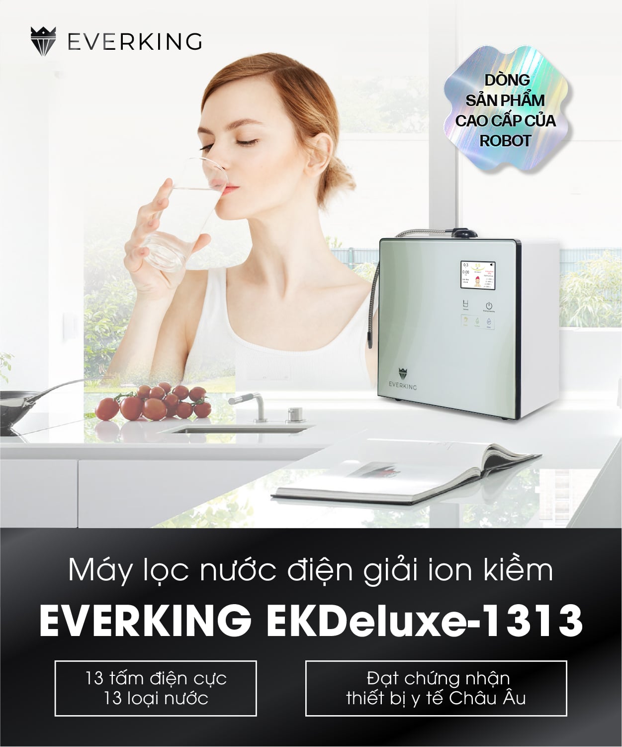 VLNĐG Kính chào anh/chị. Cảm ơn anh/chị đã quan tâm đến máy lọc nước điện giải ion kiềm tại VLNĐG. Máy lọc nước điện giải EVERKING EKDeluxe-1313 là sản phẩm được sản xuất theo tiêu chuẩn quốc tế với công nghệ đồng bộ kết hợp Bộ điện phân + Bộ vi điều khiển + Bộ lọc. Bộ lọc trên máy EKDeluxe-1313 ứng dụng công nghệ lọc UF tiên tiến hàng đầu thế giới. Hệ thống lọc đa cấp sản xuất Hàn Quốc có tác dụng lọc sạch cặn bẩn, chất tạo mùi, chất hữu cơ có hại… nhưng giữ lại khoáng chất tự nhiên trong nước đảm bảo quá trình điện phân hiệu quả và bền vững suốt vòng đời của máy. Sự kết hợp của Bô điện phân, Bộ vi điều khiển và Bộ lọc giúp máy lọc nước điện giải EKDeluxe-1313 dễ dàng tạo ra 13 loại nước điện giải nhiều nhất trên thị trường. Bên cạnh đó, máy còn được trang bị nhiều tính năng như Hỗ Trợ Giọng Nói, Sục Rửa Thông Minh, Cảnh Báo Nước Axit… mang đến sự tiện lợi và an toàn tối đa. Rất nhiều khách hàng từ sử dụng đều đánh giá máy lọc nước điện giải EVERKING EKDeluxe-1313 có chất lượng không khác gì một chiếc máy nhập khẩu. VLNĐG xin thông tin đến anh/chị.