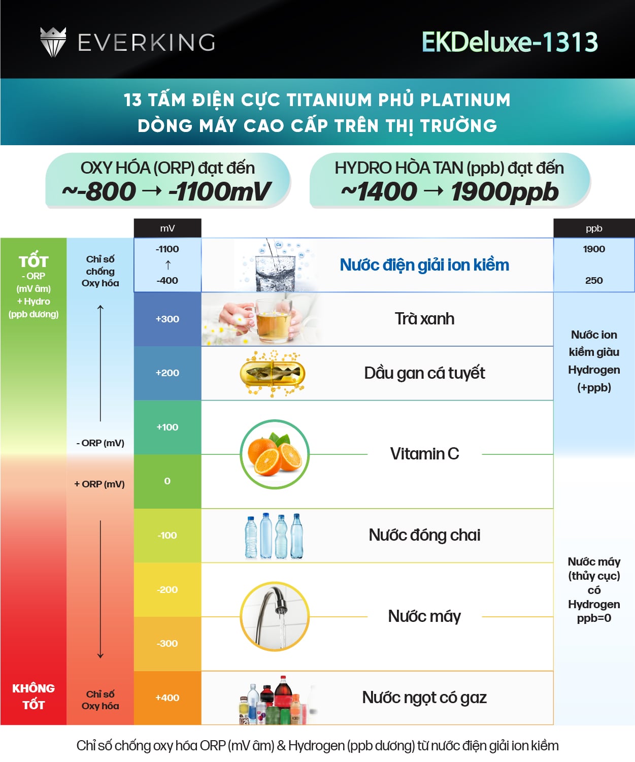 EVERKING EKDeluxe-1313 được trang bị đến 13 tấm điện cực với hàng loạt chức năng tiện ích hơn hẳn các dòng máy truyền thống trên thị trường, tạo ra được nhiều mức pH, đáp ứng mọi nhu cầu sử dụng nước và cho trải nghiệm công nghệ vượt bậc, nâng cao chất lượng sống.
