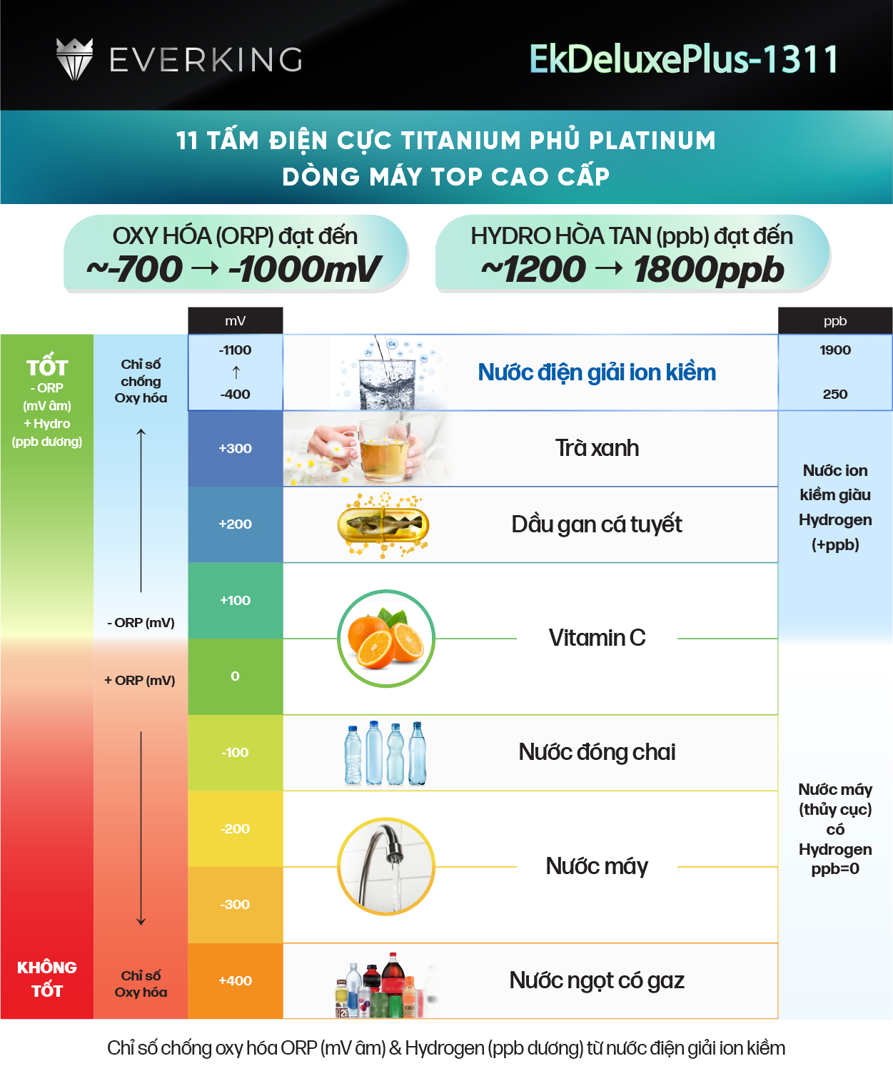 VLNĐG Kính chào anh/chị. Cảm ơn anh/chị đã quan tâm đến máy lọc nước điện giải ion kiềm tại VLNĐG. Máy lọc nước điện giải ion kiềm EVERKING EKDeluxePlus-1311 là dòng sản phẩm cao cấp của ROBOT được trang bị Hệ thống lọc đa cấp và Bộ điện phân công nghệ Hàn Quốc. Máy dùng công nghệ UF để lọc sạch cặn bẩn, màu, mùi… nhưng vẫn giữ nguyên khoáng chất đảm bảo quá trình điện phân hiệu quả. Bộ điện phân có 11 tấm điện cực làm bằng chất liệu Titanium phủ Platinum nguyên tấm phẳng, màng trao đổi ion Sumitomo Nhật Bản. Sự kết hợp của hai bộ phận này mang đến cho máy khả năng tạo ra 13 loại nước điện giải khác nhau có độ pH 3.5 – 11, nồng độ Hydro hoạt tính lên đến ~ 1500 -> 1800ppb, chỉ số chống oxy hóa (ORP) đến ~ -850 -> -1000mV. VLNĐG xin thông tin đến anh/chị.