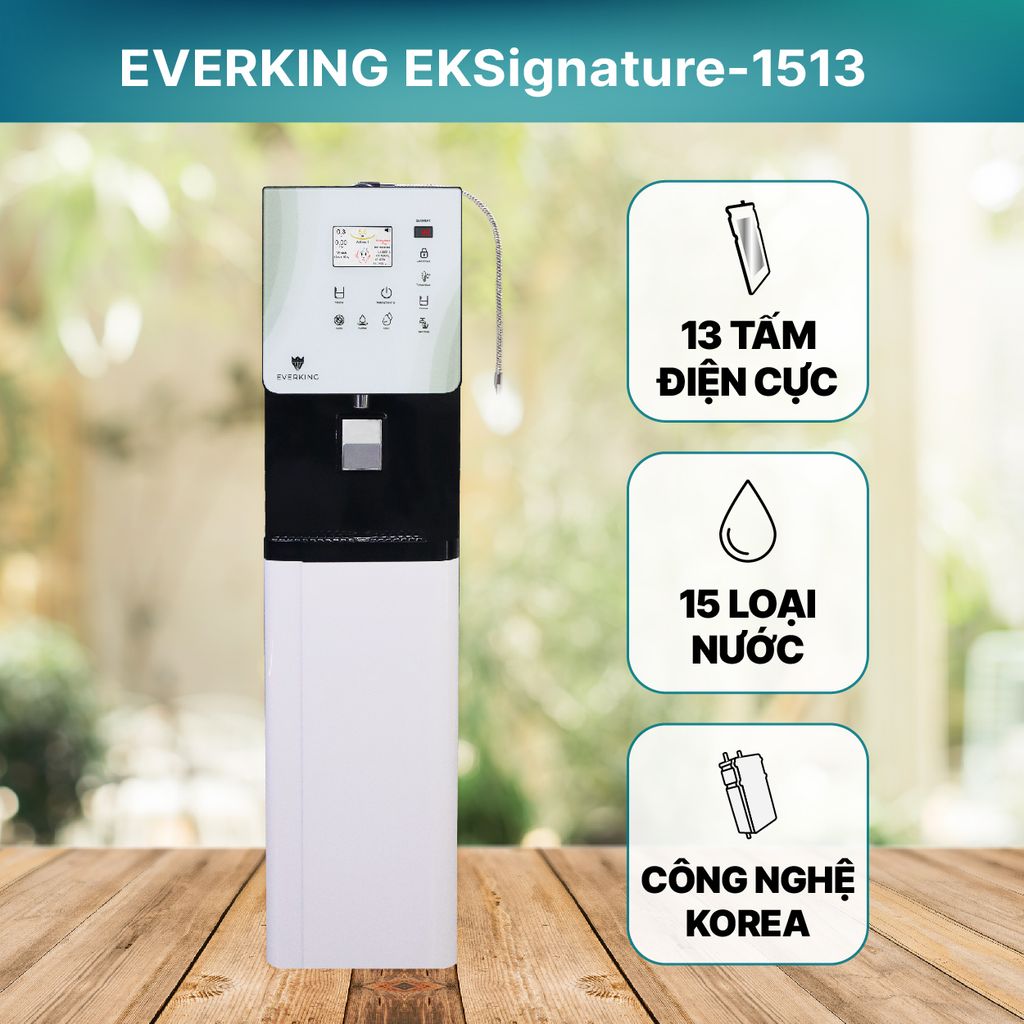 EVERKING EKSignature-1513 với 13 tấm điện cực là dòng máy có khả năng cung cấp nhiều loại nước điện giải, với 15 loại nước chức năng, phục vụ các nhu cầu sinh hoạt, gồm: