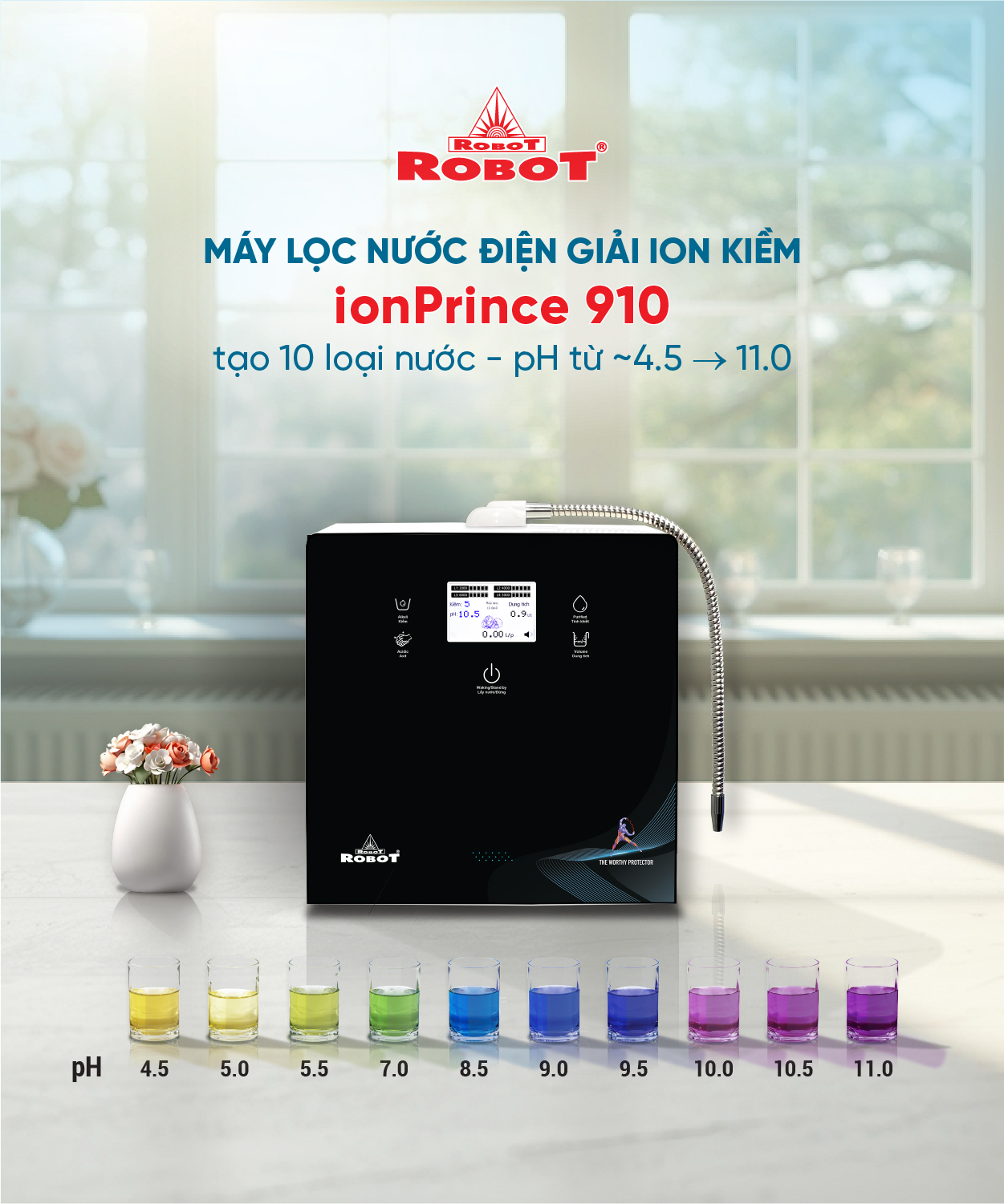 Máy lọc nước điện giải ion kiềm ROBOT ionPrince 910 là model đặc biệt sản xuất với công nghệ điện phân tiên tiến, cao cấp trang bị đến 9 tấm điện cực kích thước lớn, có khả năng tạo ra đến 10 loại nước đa chức năng:
