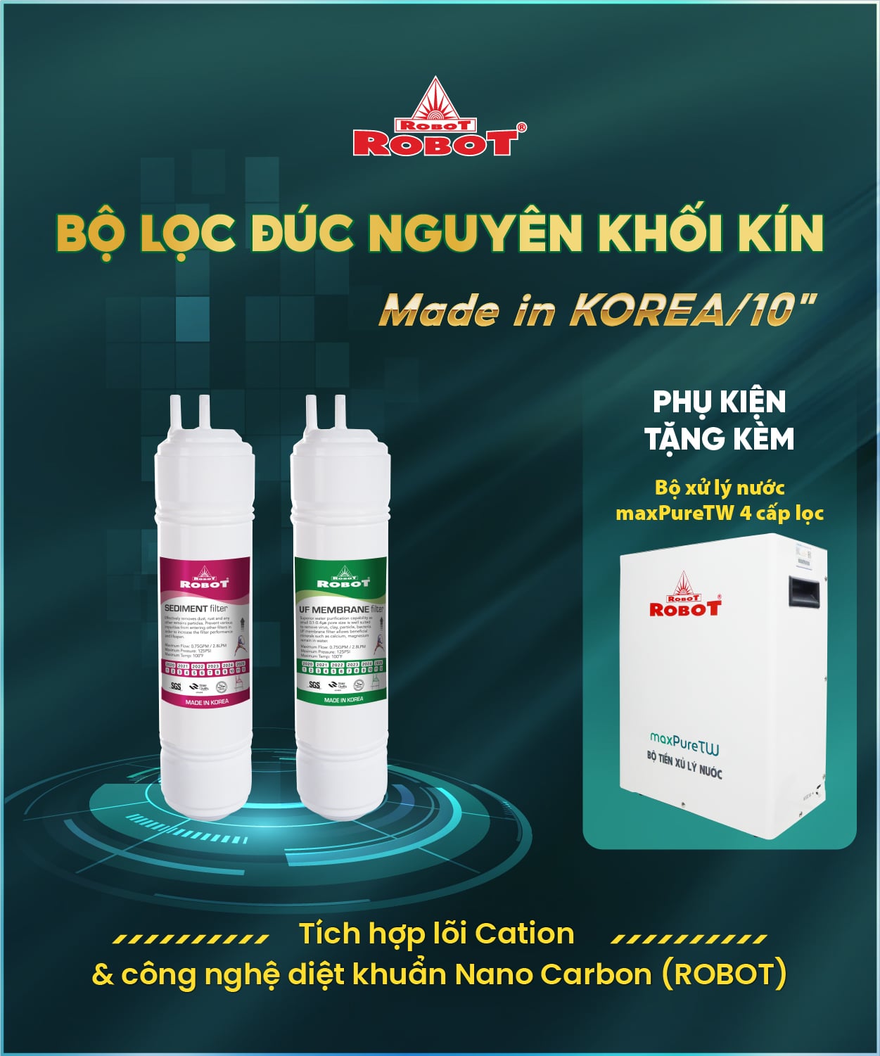 Hệ thống lọc đa cấp sản xuất Korea tích hợp lõi Cation & công nghệ diệt khuẩn Nano Carbon của ROBOT đem đến nguồn nước đạt chuẩn