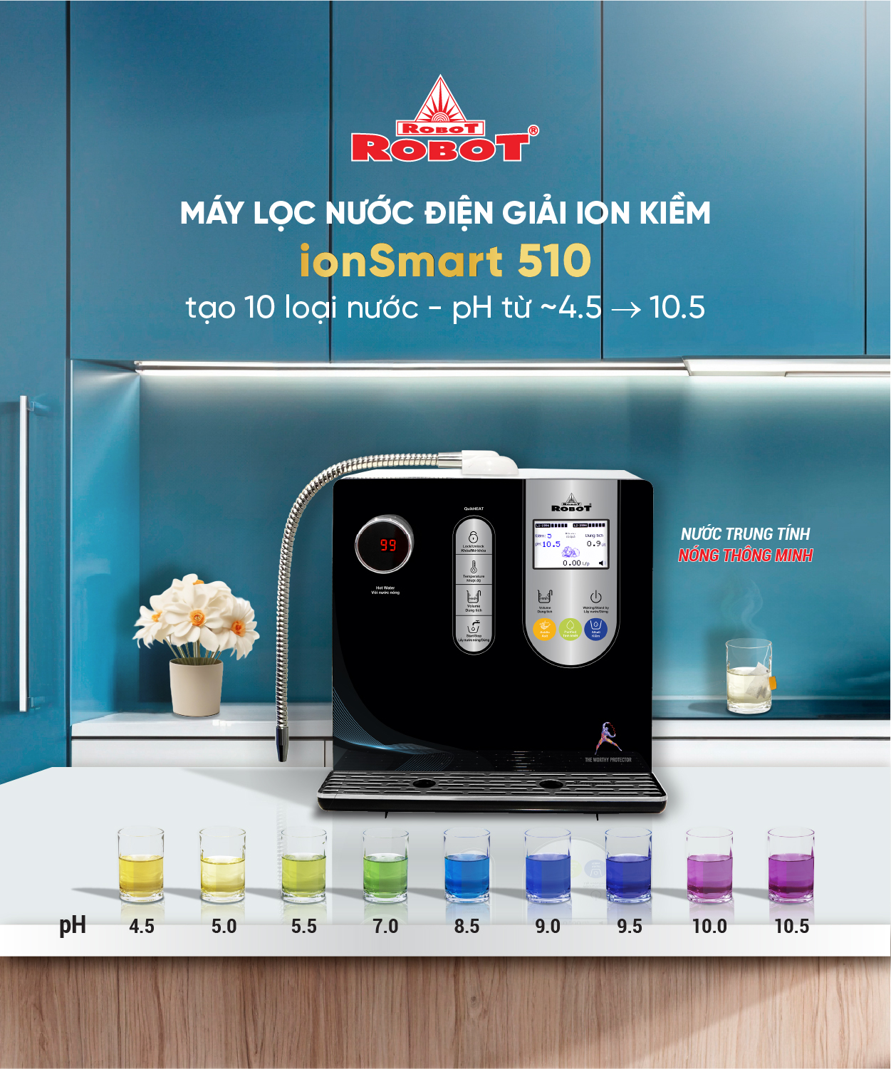Máy lọc nước điện giải ion kiềm ROBOT ionSmart 510 là model đặc biệt sản xuất với công nghệ điện phân tiên tiến, cao cấp trang bị đến 5 tấm điện cực kích thước lớn, có khả năng tạo ra đến 10 loại nước đa chức năng: