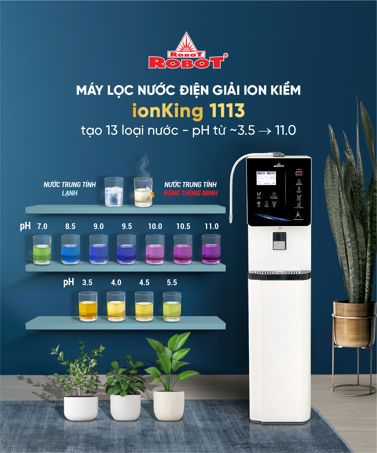 Máy lọc nước điện giải ion kiềm ROBOT ionKing 1113 là model đặc biệt – đẳng cấp được trang bị đến 11 tấm điện cực, tạo ra nhiều mức nước pH với chỉ số Hydrogen & ORP đạt tối ưu, tích hợp đầy đủ chức năng ưu việt. Ứng dụng công nghệ điện phân tiên tiến Korea, là dòng máy điện giải cao cấp – độc đáo, khả năng tạo ra đến 13 loại nước đa chức năng: