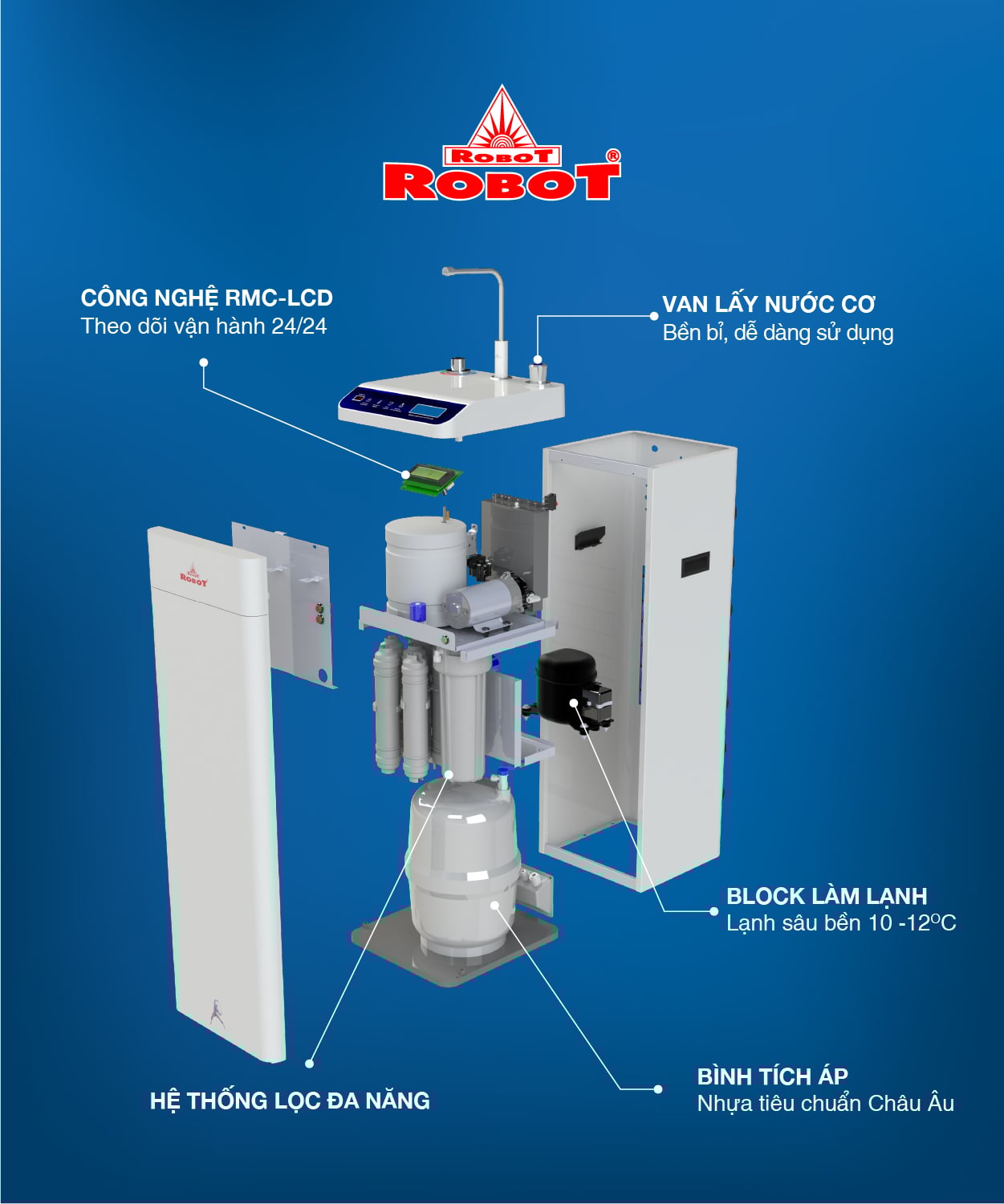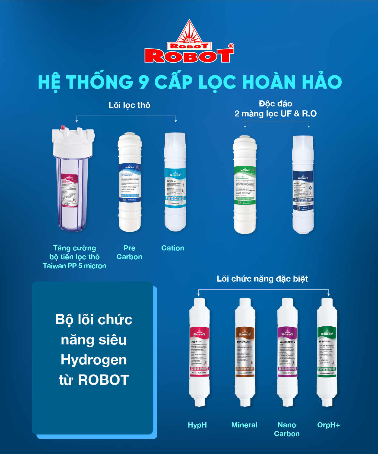 - Điểm độc đáo của ROBOT là sự kết hợp hoàn hảo cùng lúc 02 công nghệ lọc UF + RO loại bỏ lên đến 99,99% các chất gây hại, tăng tuổi thọ cho màng RO. Màng UF được bổ sung bảo vệ tối đa trong trường hợp màng R.O bị rách hay hư hỏng mà chưa kịp thay thế, nguồn nước vẫn được đảm bảo, hạn chế gây hại cho sức khỏe.