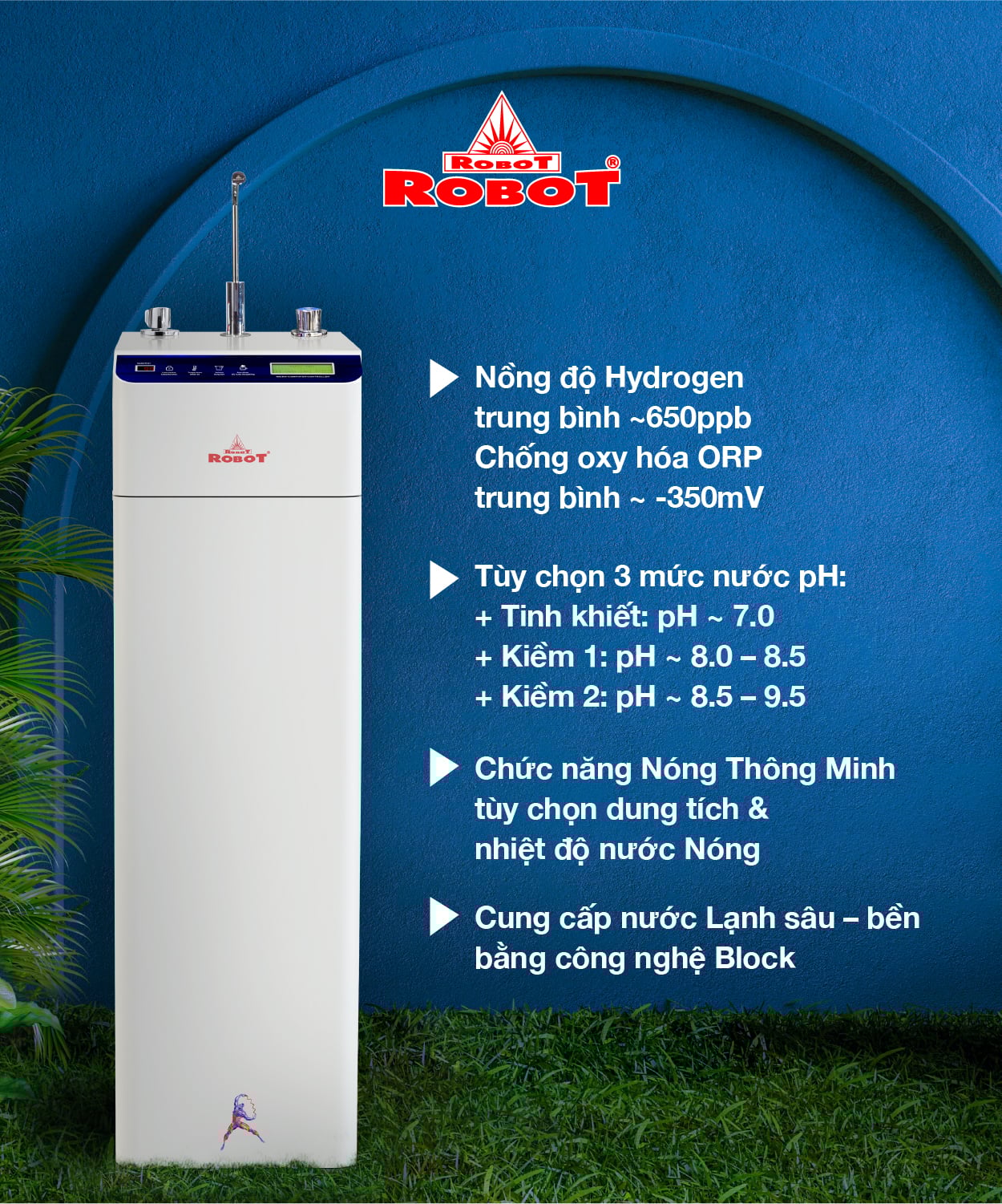 Máy lọc nước RO Hydrogen Kiềm ROBOT được các chuyên gia chuyên ngành thiết kế đặc biệt để đáp ứng nhu cầu sử dụng nước kiềm giàu Hydrogen của khách hàng tại các vùng nước đặc biệt: nước máy; nước giếng, nước lợ, nhiễm cứng, đá vôi… (đã qua xử lý thô) & nhu cầu giá thành thấp so với dòng Máy lọc nước điện giải ion kiềm.