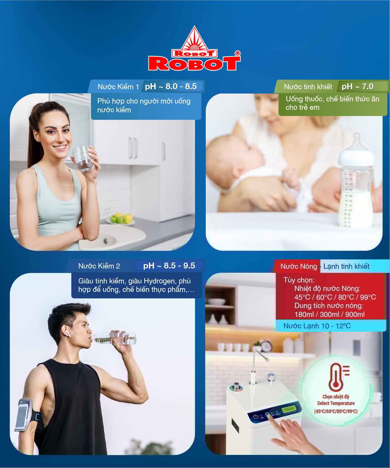 Công nghệ nóng thông minh QuikHEAT từ ROBOT tùy chọn nhiệt độ & dung lượng nước Nóng được yêu thích.