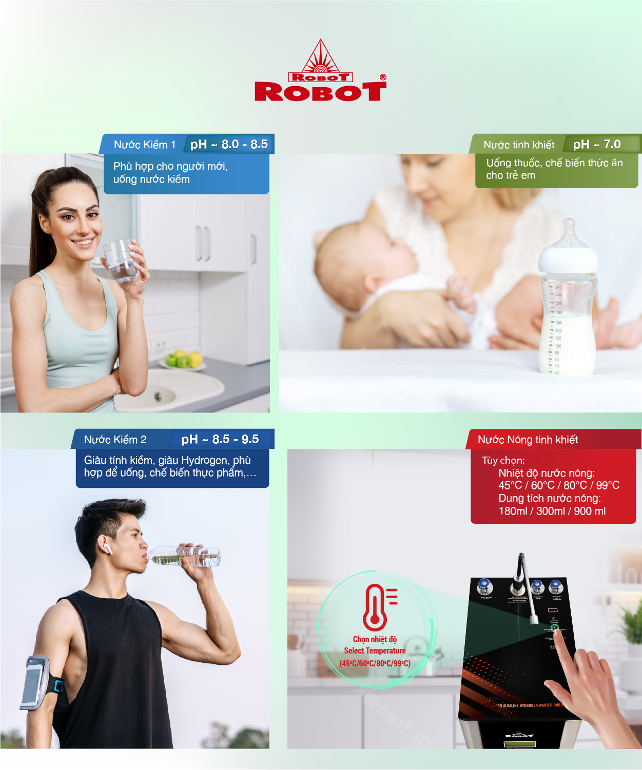 Với thiết kế độc đáo mới của ROBOT, máy có thể cung cấp 3 mức nước pH & nước Nóng thông minh 4 cấp nhiệt độ, kiểu dáng phủ kính sang trọng cùng họa tiết mới mẻ tạo điểm nhấn cho mọi không gian.