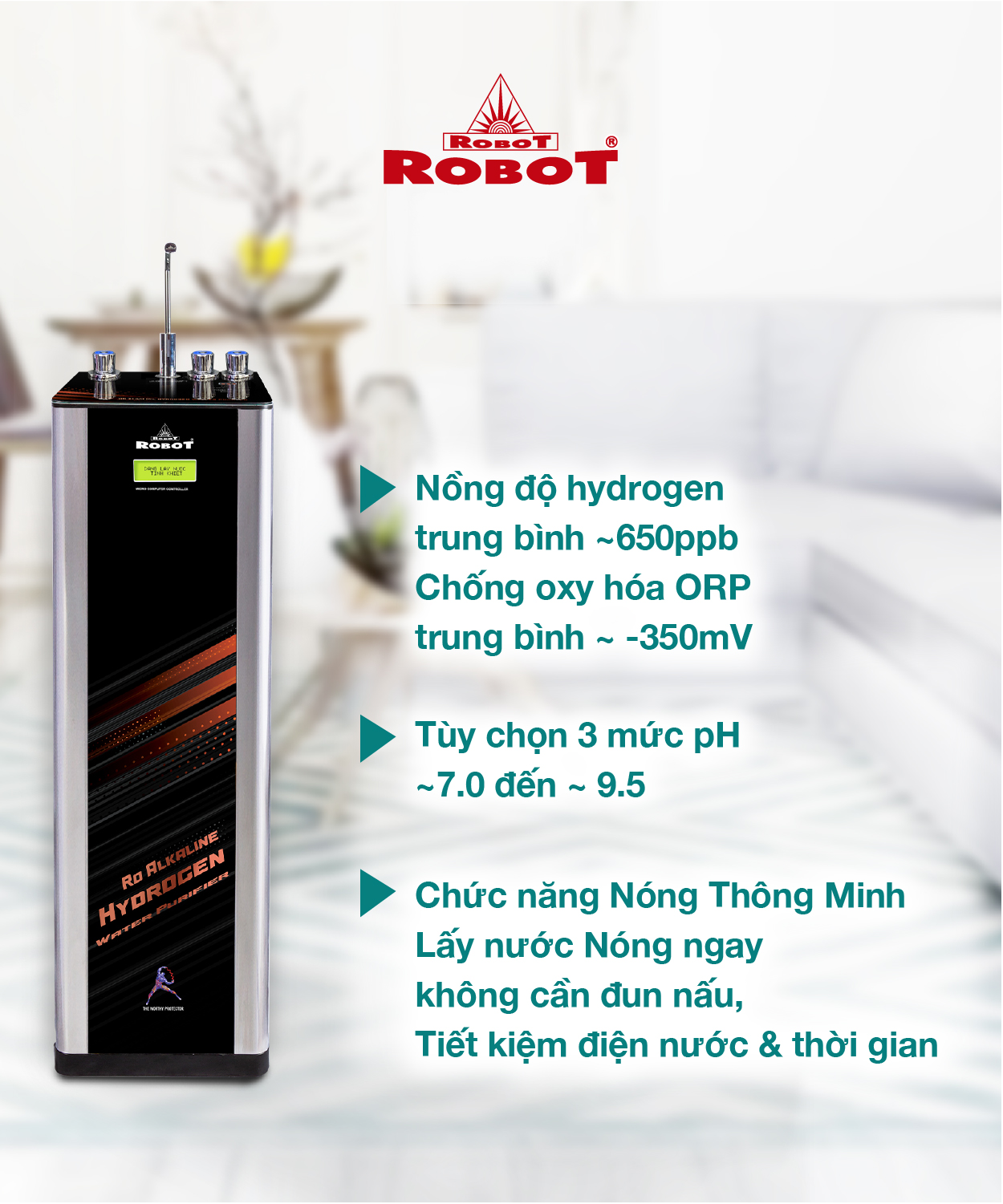Máy lọc nước RO Hydrogen Kiềm ROBOT được các chuyên gia chuyên ngành thiết kế đặc biệt để đáp ứng nhu cầu sử dụng nước kiềm giàu Hydrogen của khách hàng tại các vùng nước đặc biệt: nước giếng, nước máy, nước lợ, nhiễm cứng, đá vôi … & nhu cầu giá thành thấp so với dòng Máy lọc nước điện giải ion kiềm.