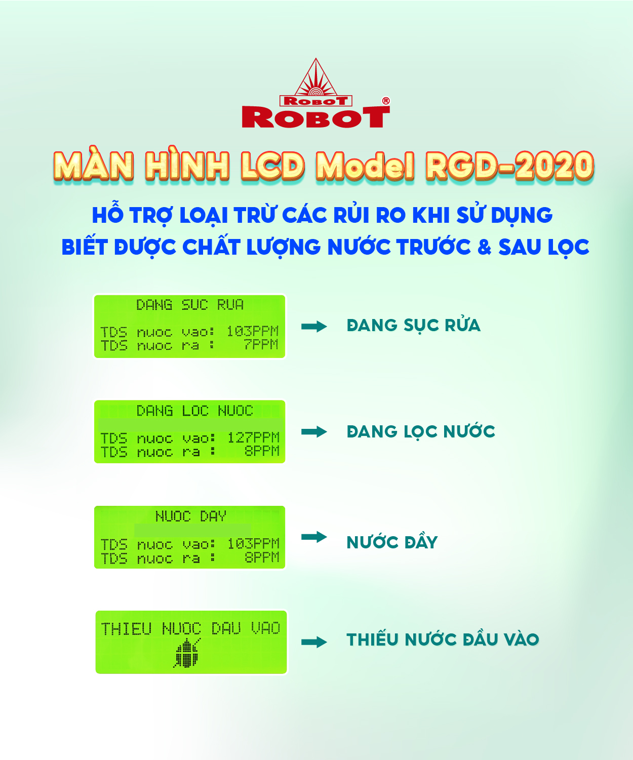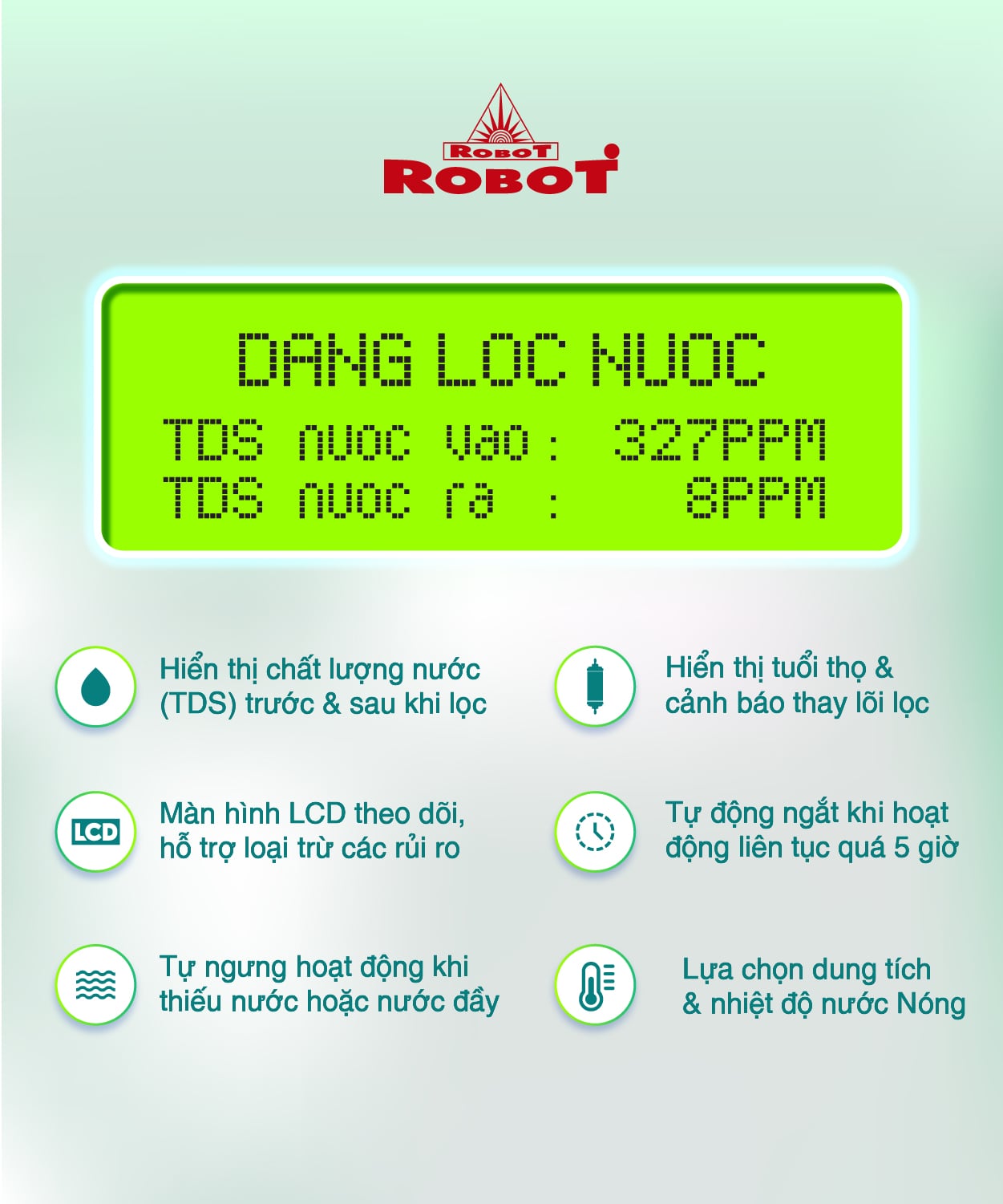 Tự hào với công nghệ vi điều khiển RMC-LCD phát minh của ROBOT khẳng định chất lượng sản phẩm & thương hiệu ROBOT trong ngành lọc nước. Sản phẩm RBs-9HAQ tiếp tục mang đến nhiều chức năng tiện tích hơn hẳn.