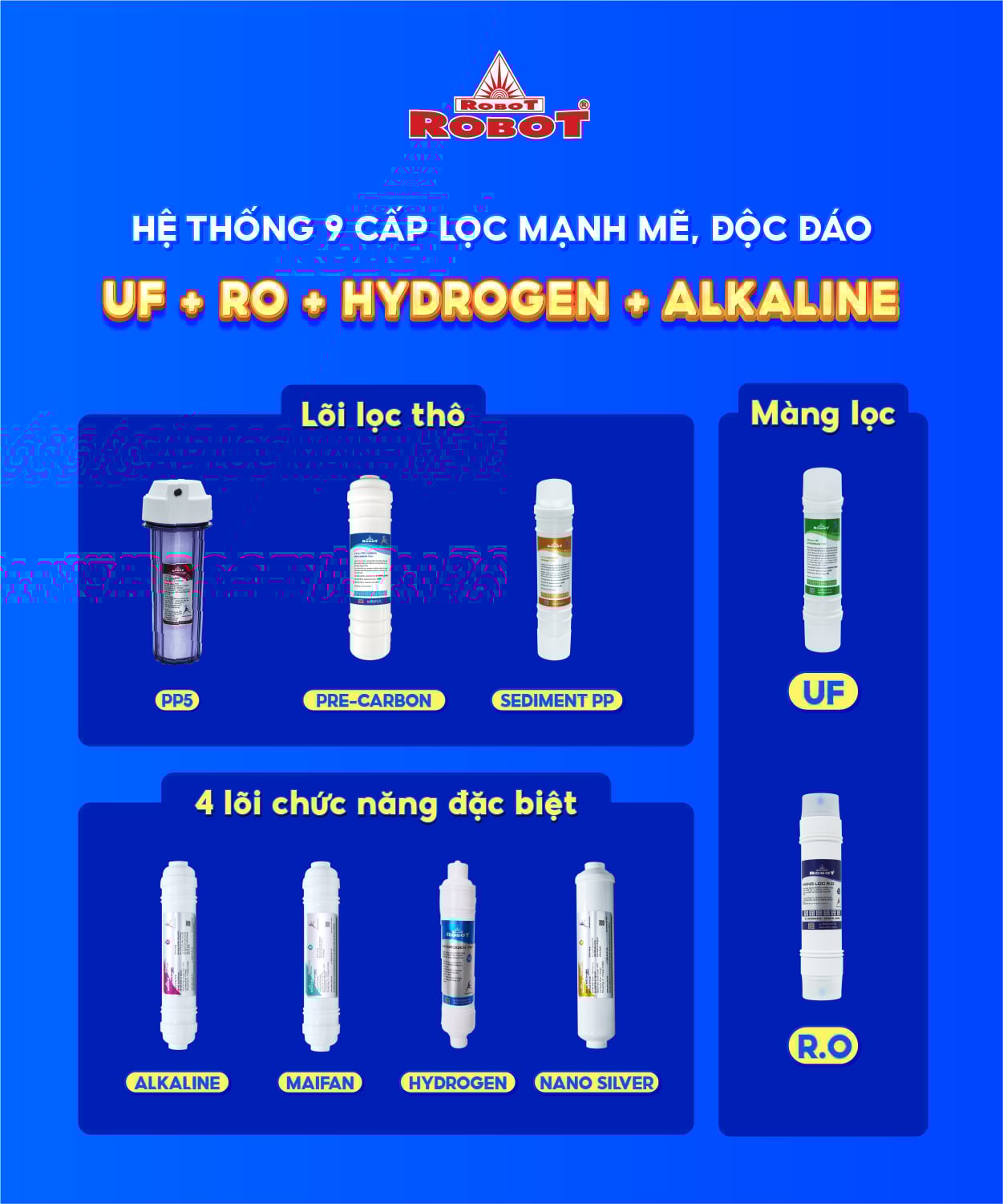9 cấp lọc: 3 cấp lọc thô + 4 lõi chức năng 2 màng lọc: UF + R.O |