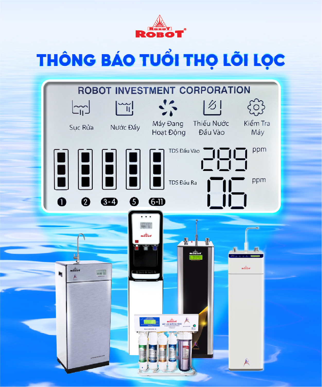 - Các sản phẩm máy lọc nước ROBOT đều sở hữu màn hình LCD sắc nét, hiển thị chi tiết các thông số TDS – chất lượng nước trước & sau lọc, tuổi thọ lõi lọc 24/24… để mọi người đều dễ dàng theo dõi hoạt động máy, chất lượng nước uống thông qua màn hình LCD, loại trừ các rủi ro, mang đến sự an toàn khi sử dụng.