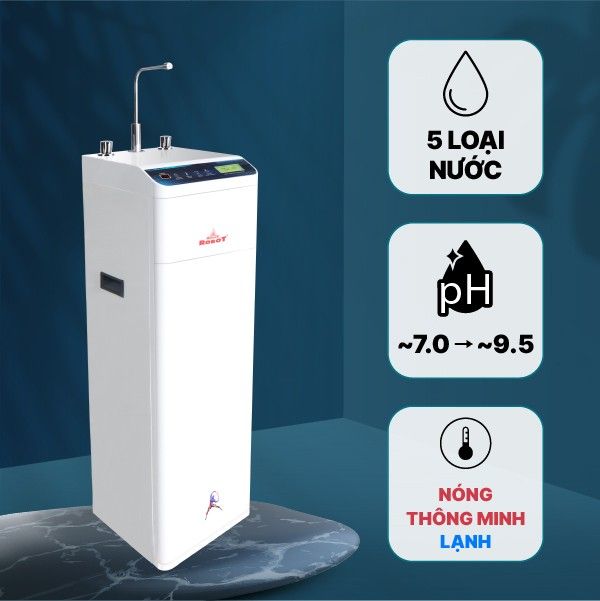 Với thiết kế độc đáo mới của ROBOT, máy cung cấp 5 loại nước: nước Kiềm 1 pH ~ 8.0 – 8.5, nước Kiềm 2 giàu hydrogen pH ~ 8.5 - 9.5, nước Tinh khiết pH ~ 7.0, nước Nóng thông minh 4 cấp nhiệt độ & nước Lạnh (Kiềm 2).